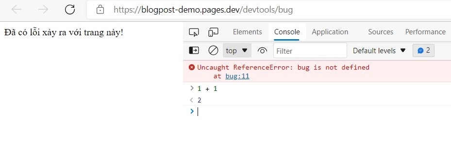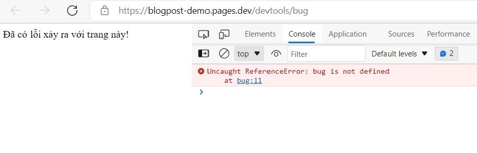 - Bên phải và/hoặc ở dưới: hiển thị vị trí lỗi, chính xác với số dòng (“bug:11” – ở đây là dòng 11). Bạn có thể nhấn vào đó. Chrome Dev Tools sẽ hiển thị chính xác dòng bị lỗi trong mã nguồn.
