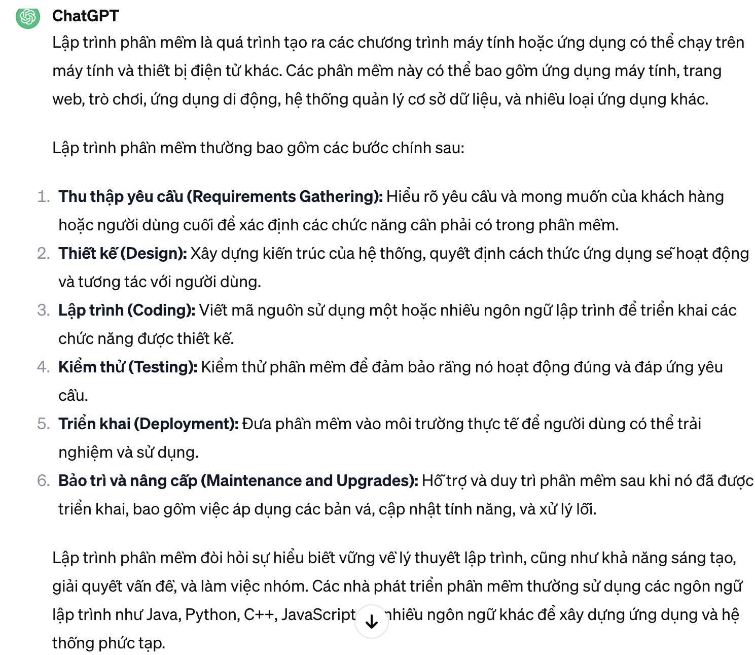 Ví dụ: Chúng tôi đã hỏi Chat GPT, “Lập trình phần mềm là gì”: