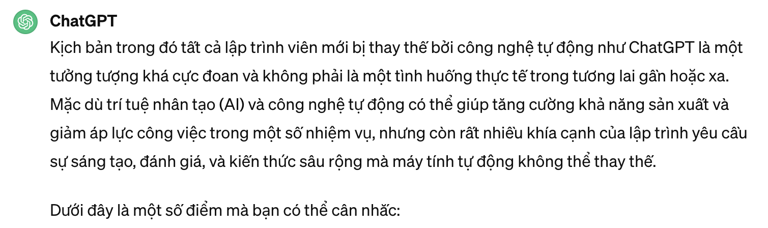 Tôi đã đặt cho chat GPT 1 câu hỏi: Tương lai của công nghệ phần mềm sẽ như thế nào nếu tất cả các lập trình viên mới bị thay thế bởi ChatGPT?