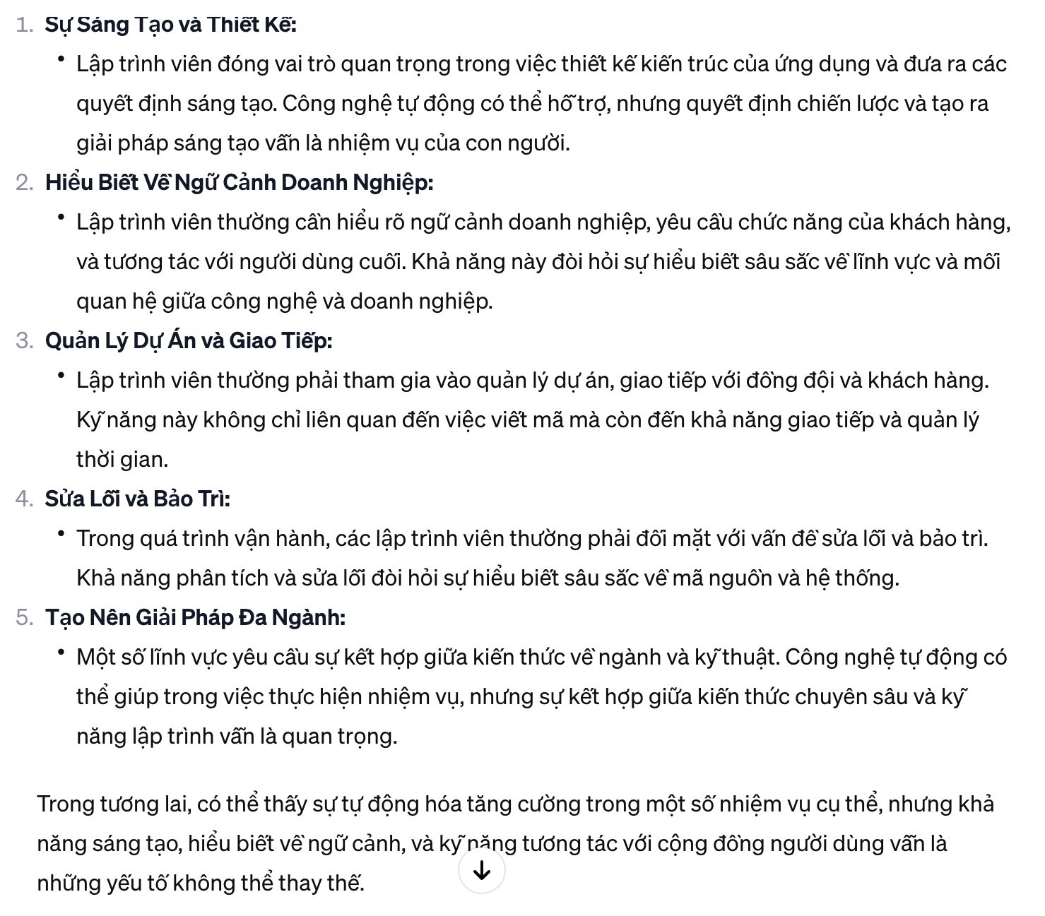 - Ngoài ra những lập trình viên có kinh nghiệm không thể có đủ thời gian để làm tất cả mọi thứ trong một dự án lập trình. Vì thế họ cũng cần những lập trình viên chưa có kinh nghiệm xử lý cho họ những task đơn giản. Lúc này việc cần làm của những lập trình viên chưa có kinh nghiệm là học cách sử dụng chat GPT, biến nó thành trợ thủ đắc lực cho mình trong việc giải quyết vấn đề và học hỏi thêm các kiến thức hệ thống của những lập trình viên đã có kinh nghiệm